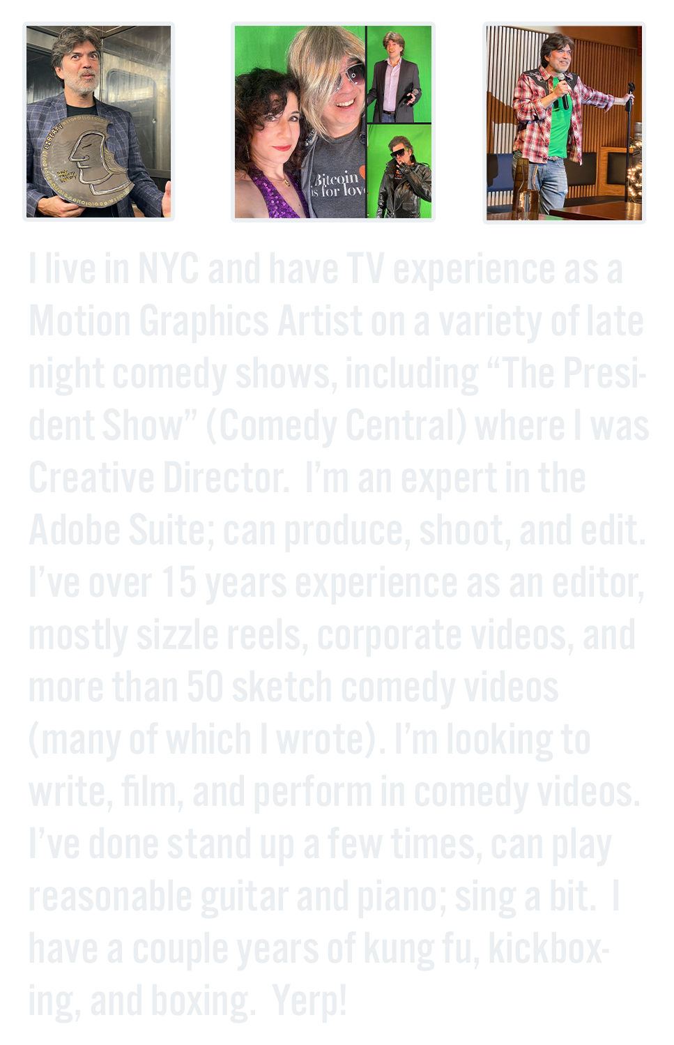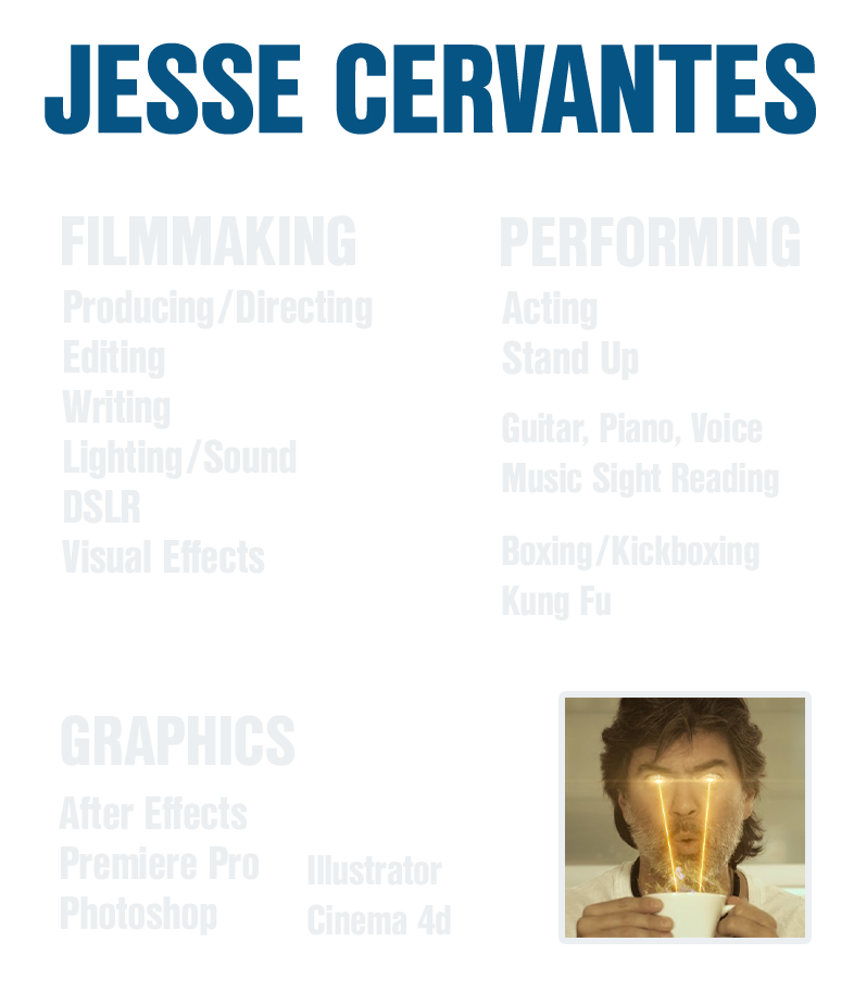 Jesse Cervantes - actor, writer, producer, motion graphics, adobe photoshop, premiere pro, after effects, videographer, stand up comic
